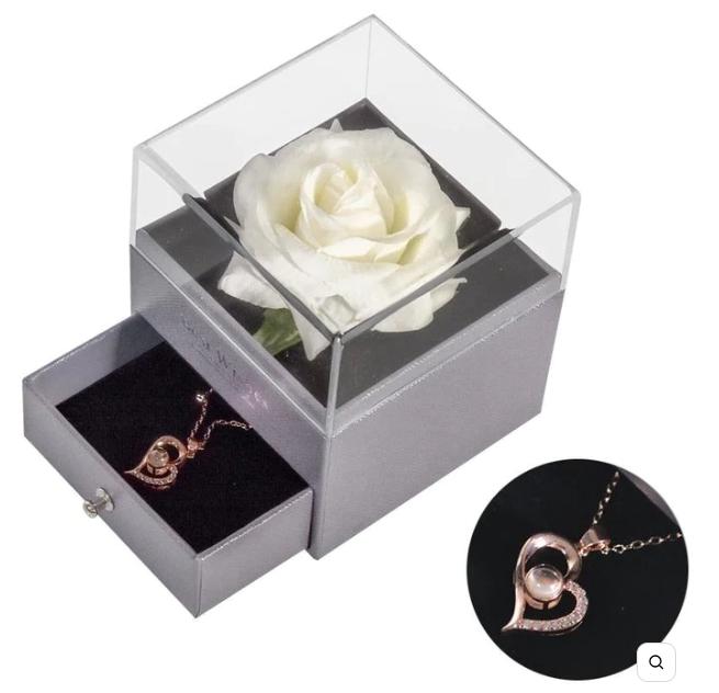 Símbolo de Eternidade: Além da mensagem multilíngue, cada colar é acompanhado por uma rosa eterna. Esta flor preservada simboliza a durabilidade e a eternidade do seu amor, refletindo o preço eterno que você sente pela mulher que faz seu coração vibrar.